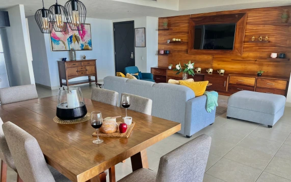 Este impresionante pent-house en el séptimo piso ofrece vistas panorámicas espectaculares a las aguas cristalinas de la playa Esmeralda, enmarcadas por las montañas verdes que rodean la bahía. Disfruta de una cena al aire libre rodeado de vegetación tropical, ideal para una parrillada bajo las estrellas.