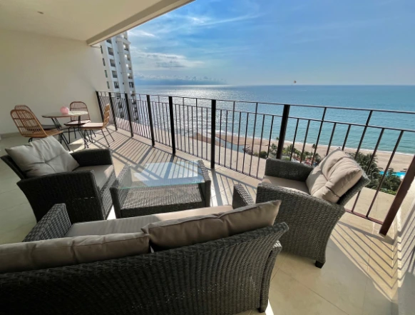 Descubre tu oasis en este hermoso condominio en la Torre 3000, donde confort y vistas espectaculares se unen. Cuenta con jacuzzi privado en el balcón con una vista increíble a la bahía. La recámara principal tiene cama king size y baño en suite; la segunda, dos camas queen y baño privado. Ambas con Smart TV, aire acondicionado y ventiladores.